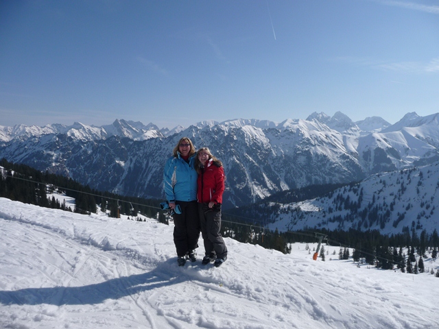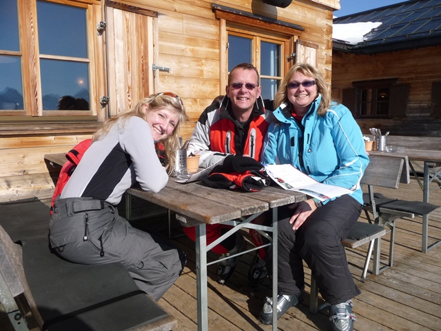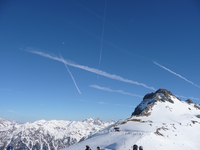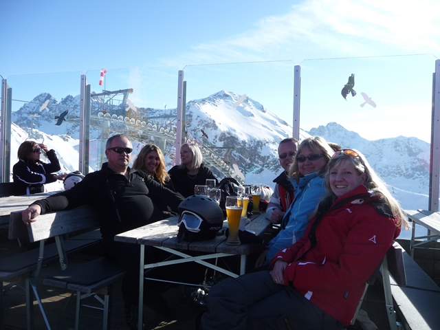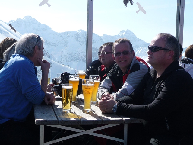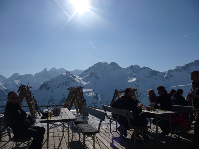 Zur Mittagszeit traf sich dann die gesamte Gruppe an der Kanzelwand-Bergstation auf 1.957 Meter Höhe im Panoramarestaurant. Man tauschte kurz die Vormittagserfahrung aus, stärkte sich mit leckerem Essen, bevor es für den ein oder anderen wieder auf die Pisten ging. Die Anderen genossen schon jetzt, aufgrund der immer schlechter werdenden Schnee-und Pistenverhältnisse, den gemütlichen Teil und ließen es sich auf der Sonnenterasse oder im Liegestuhl bei frühlingshaften Temperaturen gut gehen.