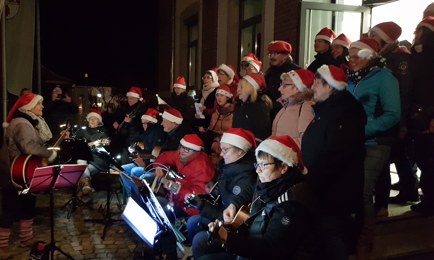 Am vorletzten Samstag brachte der Chor „NEW AGE“, unterstützt von den Salacher Gitarrenfreunden und der VHSGitarrengruppe Kuchen, fröhliche und besinnliche Stimmung auf den Kuchener Adventsmarkt. Auf der Treppe vor dem Rathaus war die große Gruppe ein Magnet und viele Besucher blieben stehen und sangen und klatschten mit. Ein buntes Bouquet von Weihnachts- und Winterliedern von besinnlich bis rockig wurde präsentiert. Die Gruppe war international eingestimmt und sang in deutscher, schwäbischer, englischer und spanischer Sprache. Alle hatten sichtlich Freude, endlich wieder singen zu dürfen.