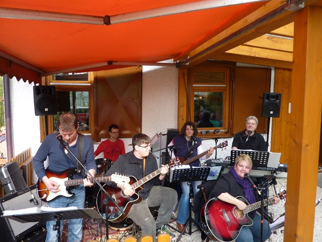 Pünktlich zum Mittag befeuerte unser Grillmeister den Grill. Spätestens da, war der lange strenge Winter längst vergessen und schon nach kurzer Zeit zogen geschmackvolle Düfte von leckerem Grillgut durch den Wald, was natürlich zugleich immer mehr Gäste anzog. Auch bereitete sich langsam die Aichelberger Band „The Falling Rocks“, bestehend aus Claudia Mann, Klaus Gruber, Rainer und Erika Fahrenschon, sowie die Gastmusiker Sebastian Mann und Daniel Straub, auf ihren Auftritt vor.
