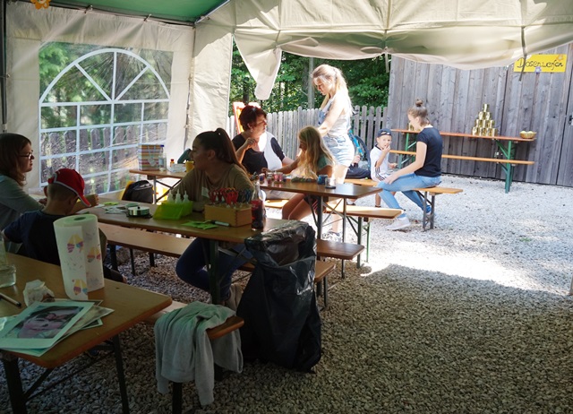 In der Bastel- und Schminkecke wurde wieder um die Wette geschnitten, geklebt und gemalt. Aus Marmeladengläser und lustigen Figuren wurden supertolle Schneekugeln gebastelt. Beim Kinderschminken verzierten viele schöne bunte Motive die Gesichter.